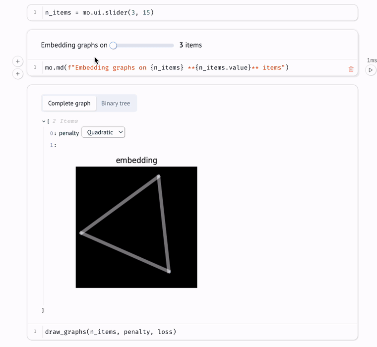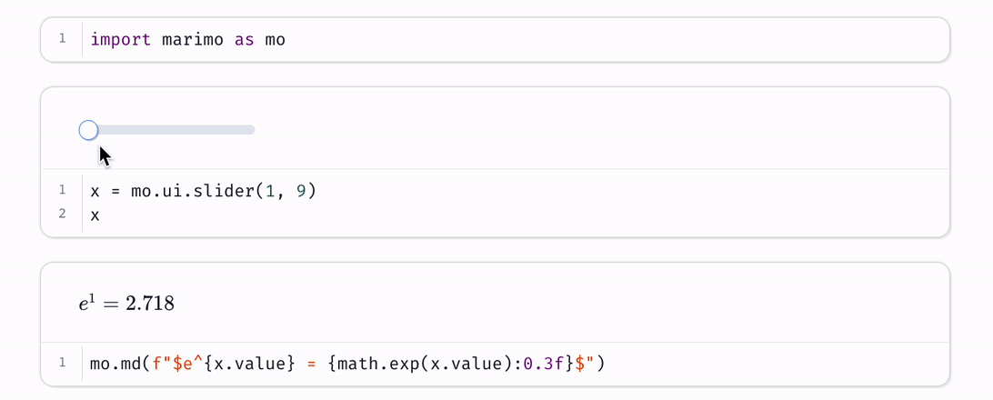 • reactive: run a cell and marimo automatically runs cells that depend on it