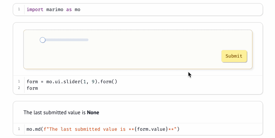 sliding a slider), marimo sends the new value back to Python and reactively